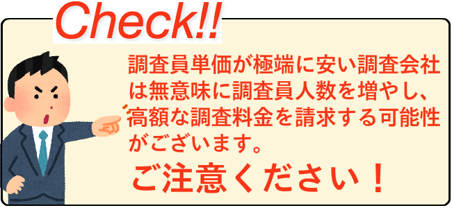 ・調査員人数は案件によって変動いたします、面談にて相談員がご提案させていただきます。